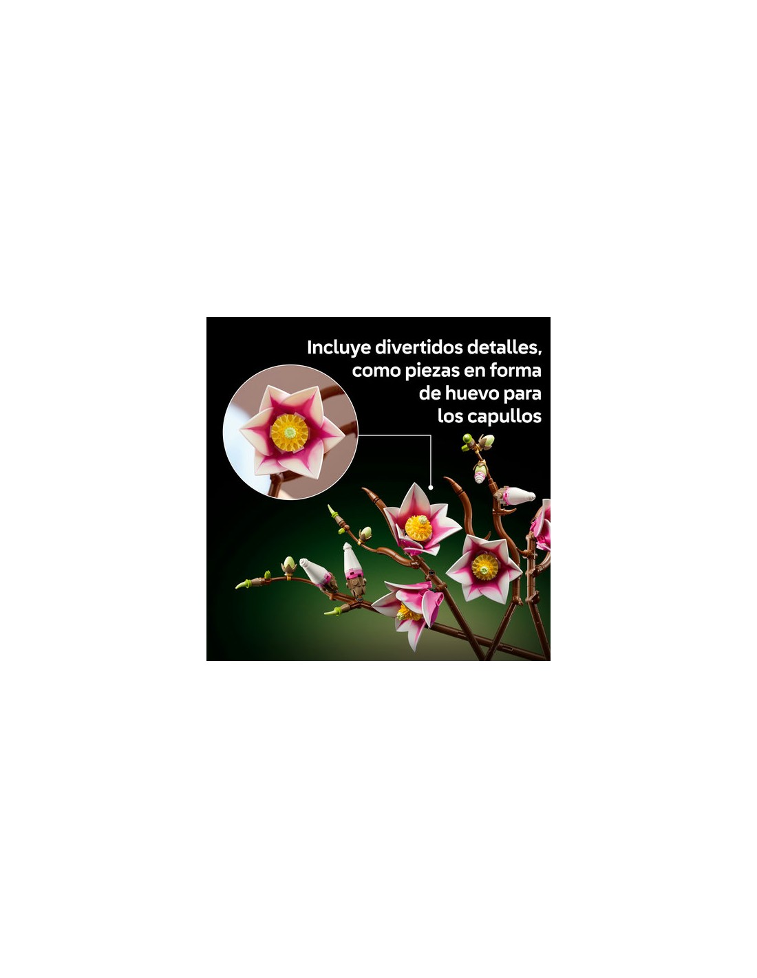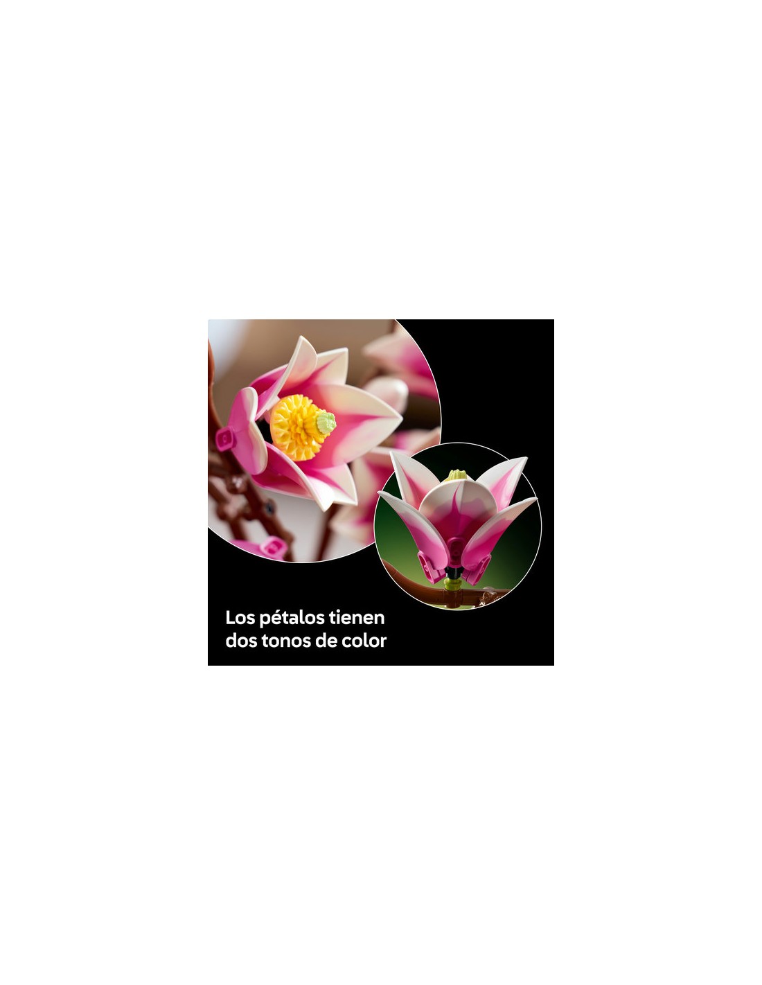 ¡Sumérgete en la naturaleza con el set de construcción para adultos LEGO Botanicals Ramas de Magnolia (11510)! Relájate mientras creas una hermosa pieza de decoración floral formada por 5 detalladas ramas de magnolia. Este es uno de los sets LEGO Botanicals que incluyen ramas, y los pétalos de magnolia presentan 2 tonalidades para conseguir mayor realismo. Descubrirás simpáticas sorpresas, como piezas que representan cupcakes para los carpelos de las flores artificiales, ranas marrones que simulan nudos de rama, huevos de juguete para los capullos y espirales de helado para los brotes. Una vez construidas, las flores LEGO se convierten en un magnífico objeto de decoración para el salón, el dormitorio o la oficina y pueden combinarse con otros sets LEGO Botanicals (a la venta por separado). Este kit de construcción es un regalo idóneo para mujeres y hombres en ocasiones como cumpleaños, el Día de San Valentín o el Día de la Madre. También está disponible en la app LEGO Builder, donde puedes acceder a instrucciones digitales.