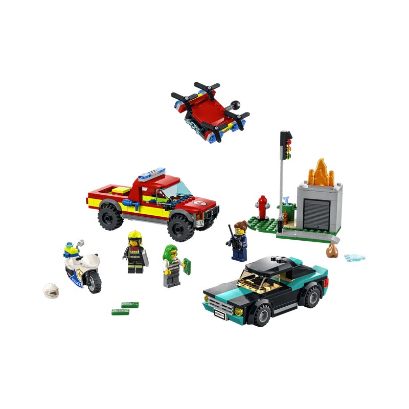 La caja contiene una furgoneta de bomberos con un dron, una moto de policía, un coche de una ladrona, una escena de un incendio con un semáforo, una figura de un gato y 3 minifiguras, entre ellas Bob, el personaje LEGO City de la tele