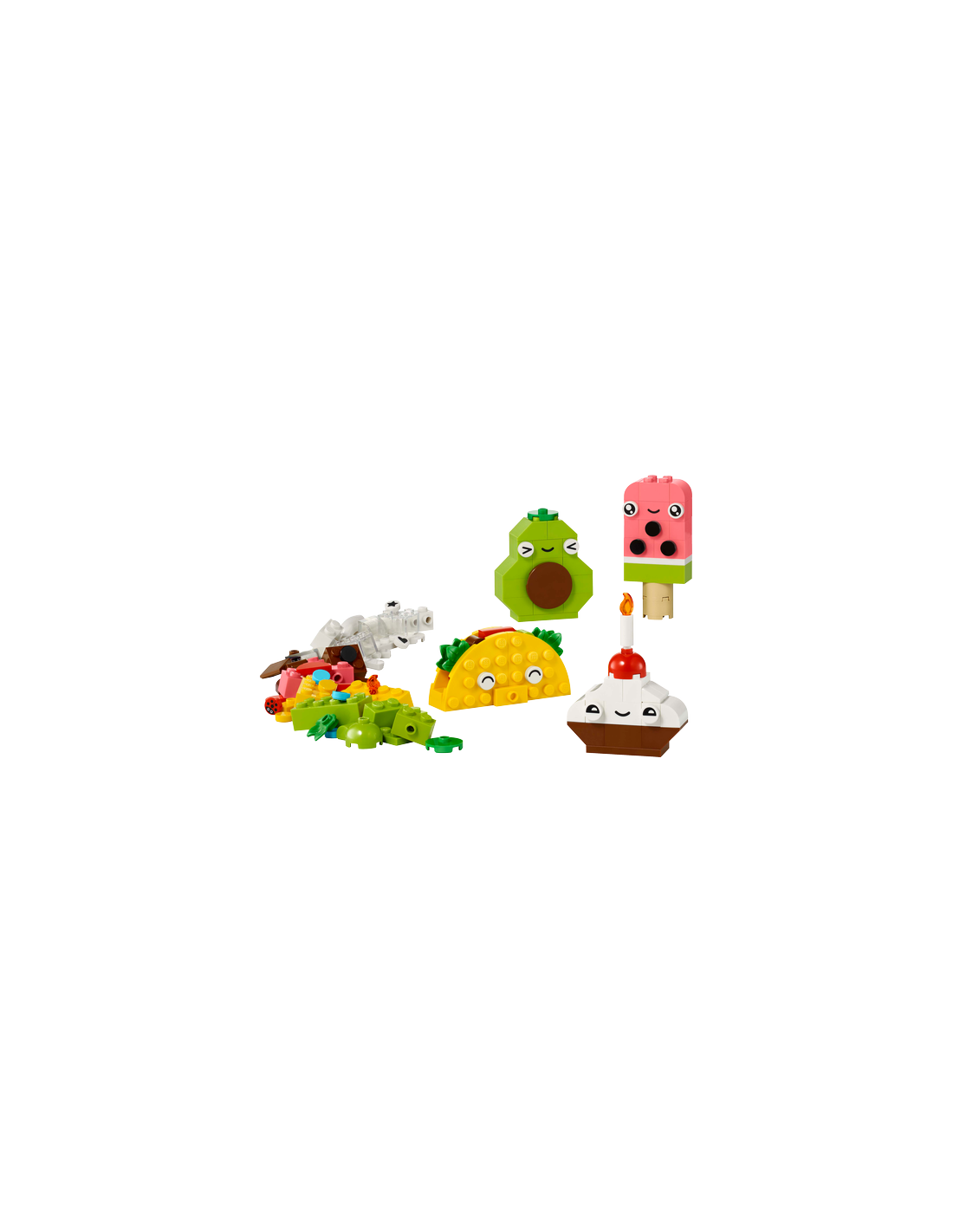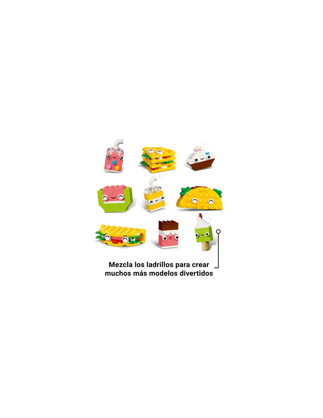 Los peques usan el cautivador surtido de ladrillos y piezas especiales (ojos, bocas y elementos decorativos) para construir 4 simpáticos amigos nutritivos: un cupcake, un helado, un aguacate y un taco. Luego mezclan los ladrillos para convertirlos en una tarta con chispitas, un té de burbujas, una pera y un bocadillo. Cuando adquieran confianza, pueden seguir la guía y cambiar las expresiones, las formas y los colores para hacer nuevos amigos nutritivos, como un helado verde, un brik de zumo, una raja de sandía, una chocolatina y un megasándwich.