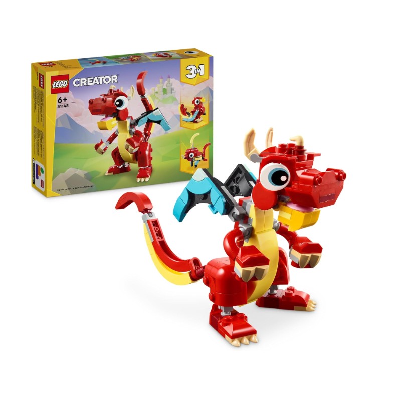Los peques creativos a partir de 6 años pueden viajar a una tierra mágica llena de divertidas historias con el set de construcción de juguetes de animales 3en1 Dragón Rojo (31145). Contiene un simpático dragón de juguete con grandes ojos y alas, patas, garras, cabeza y boca articuladas para que los niños puedan elegir cómo usarlo en sus juegos de aventuras y exponerlo después.