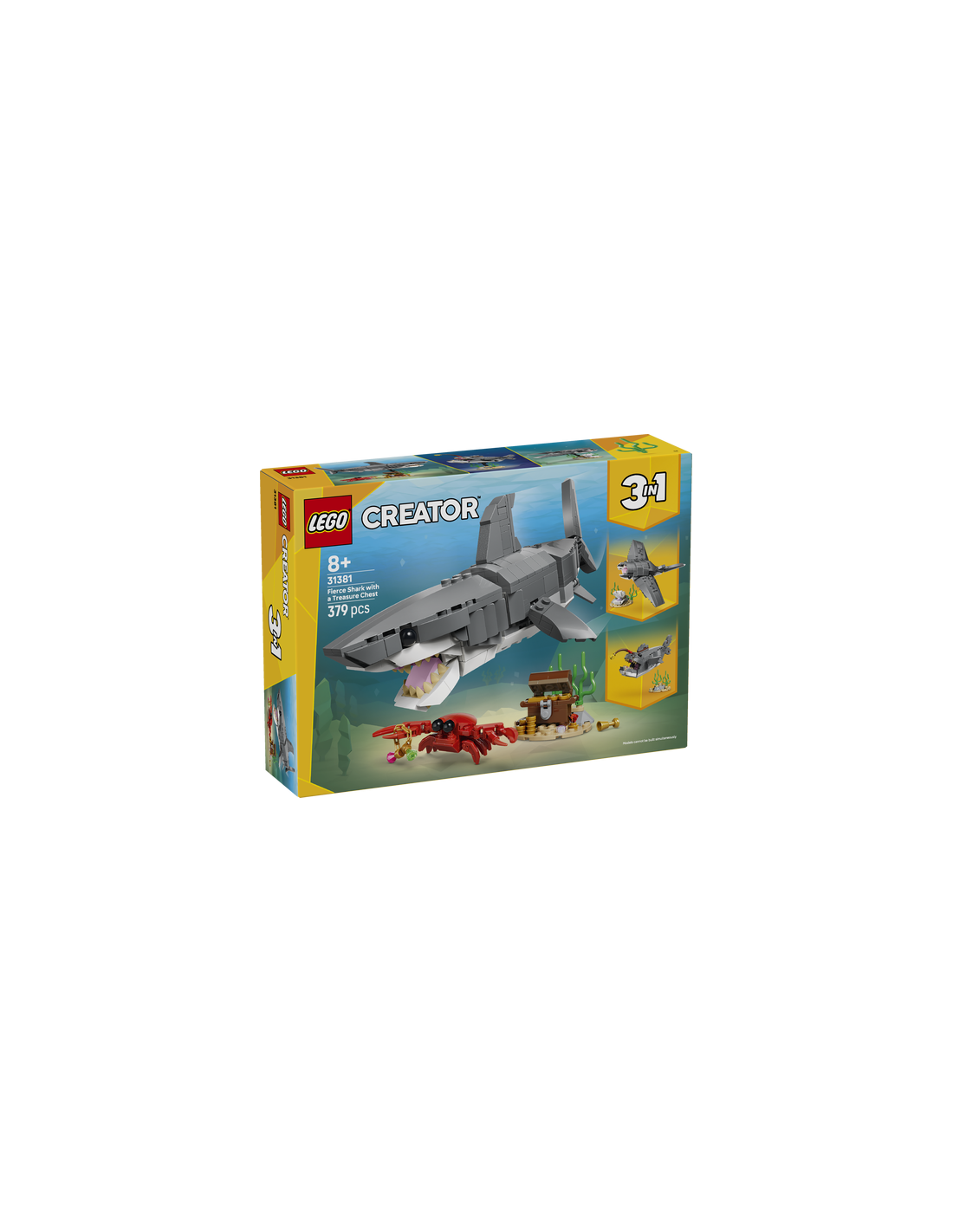 ¡Los niños y las niñas a partir de 8 años podrán interpretar divertidas historias con el juguete LEGO Creator “3 en 1” Feroz Tiburón con Cofre del Tesoro (31381)! Este impresionante set basado en animales marinos ofrece a los peques 3 opciones deconstrucción diferentes con los mismos ladrillos. Pueden construir un tiburón articulado y colocarlo en un soporte con un cofre del tesoro y un cangrejo. Después, todo esto lo convertirán en un pez abisal sobre un soporte con plantas marinas o en una mantarraya articulada sobre un soporte con una concha de almeja. Una vez terminadas las sesiones de construcción y juego, cada modelo se puede exponer en una estantería o un escritorio. Este set LEGO Creator “3 en 1” estimulará la imaginación de los más jóvenes y es una fantástica idea de regalo para ellos. Además, la app LEGO Builder les reserva una gran aventura de construcción con sus instrucciones 3D y herramientas. Los modelos no se pueden construir simultáneamente. Contiene 379 piezas.