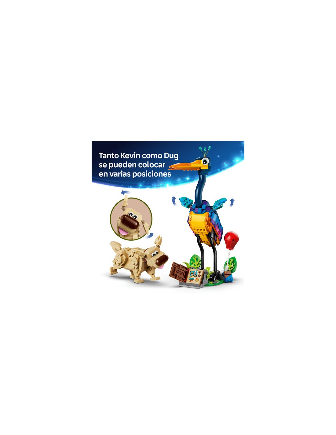 ¡Los peques vivirán divertidas aventuras con el set de construcción LEGO | Disney Pixar Kevin y Dug (43290)! Basado en la película Up, el set incluye, por primera vez en un juguete LEGO | Disney y Pixar, al pájaro Kevin y el perro Dug. Trae también una base con hojas móviles y espacio para el cuaderno Mi diario de aventuras, un globo rojo, el cono de la vergüenza, el collar especial de Dug y más. Las figuras del perro y del pájaro inspirarán juegos llenos de imaginación y después, se pueden exponer como decoración del dormitorio infantil y juvenil. Este juguete es una óptima idea de regalo Disney de cumpleaños para niñas y niños a partir de 9 años, para familias y adultos fans de Up y de los perros y pájaros de juguete. Además, se puede combinar con otros sets LEGO y juguetes de construcción LEGO | Disney (a la venta por separado). Haz realidad la ilusión de tu peque por jugar a recrear escenas de la película Up con un modelo que ofrece divertidas posibilidades de juego. Invita a otros a pasarlo genial construyendo con el modo Construye en Compañía de la app LEGO Builder.
