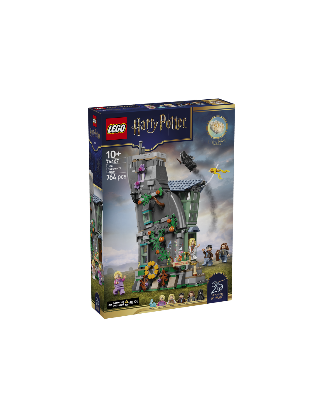 Explora el excéntrico mundo de los Lovegood con el primer modelo LEGO Harry Potter de la original casa de Luna Lovegood (76467). Este juguete de construcción, un mágico regalo para niñas, niños y fans de Harry Potter a partir de 10 años, les permite reproducir la pintoresca y encantadora casa, y dar vida a las escenas de Harry Potter y las reliquias de la muerte con 5 minifiguras. Saca los muebles de la cocina para jugar cómodamente y activa el ladrillo LEGO con luz para proyectar imágenes de La fábula de los tres hermanos en la pared. Echa un vistazo al dormitorio de Luna y la imprenta de Xenophilius Lovegood. Y, después, recrea la huida de los héroes con el cuerno de Erumpent. El set incluye también el Patronus liebre de Luna, uno de los Patronus que integran la edición del 25.º aniversario de LEGO Harry Potter (a la venta por separado). Con la app LEGO Builder y sus instrucciones digitales fáciles de seguir, los peques podrán construir con confianza. El set contiene 764 piezas.