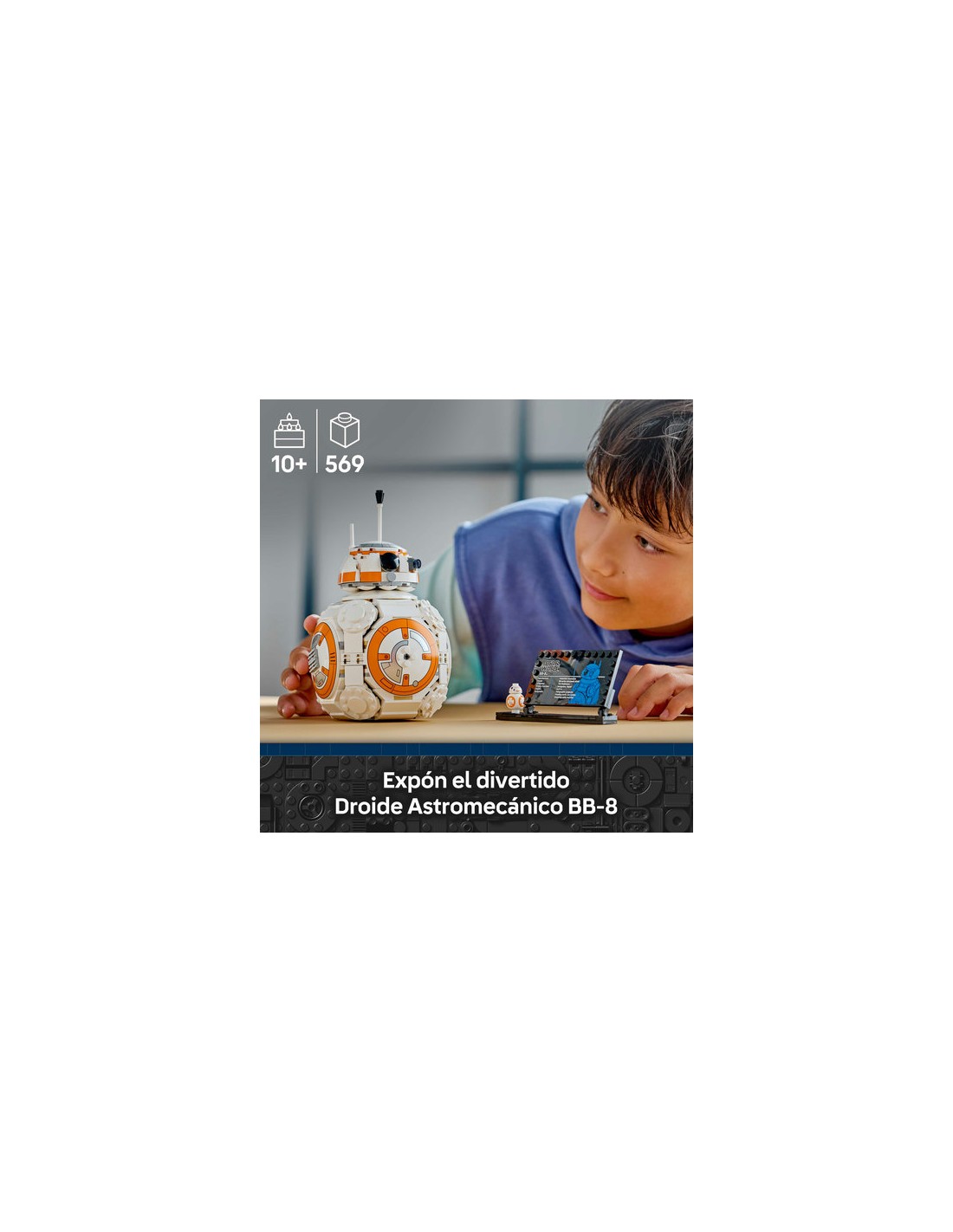 ¡Sube el nivel de ternura a tope con el juguete de construcción LEGO Star Wars Droide Astromecánico BB-8 con cabeza giratoria! Usa ladrillos LEGO para reproducir los detalles del emblemático droide tal y como aparece en Star Wars: El Despertar de la Fuerza. Mueve a BB-8 sobre una superficie plana para que su cabeza gire en direcciones aleatorias. Abre la compuerta del cuerpo de BB-8 para descubrir un “brazo soplete” como el que usa para hacerle el gesto del pulgar hacia arriba a Finn.
