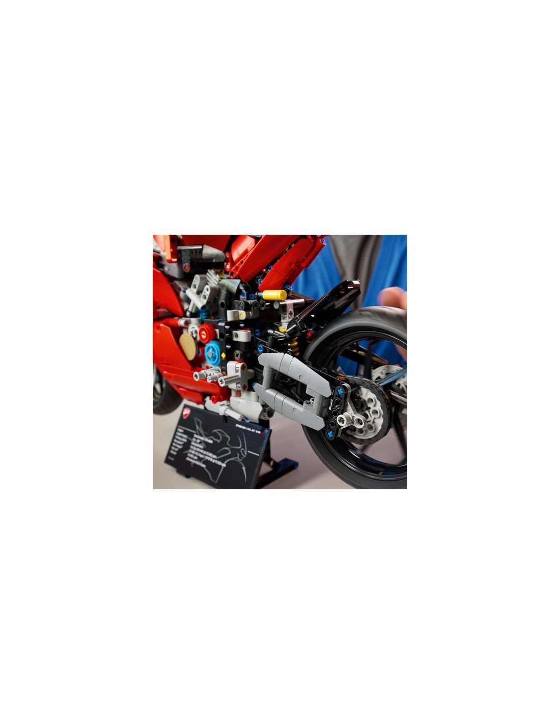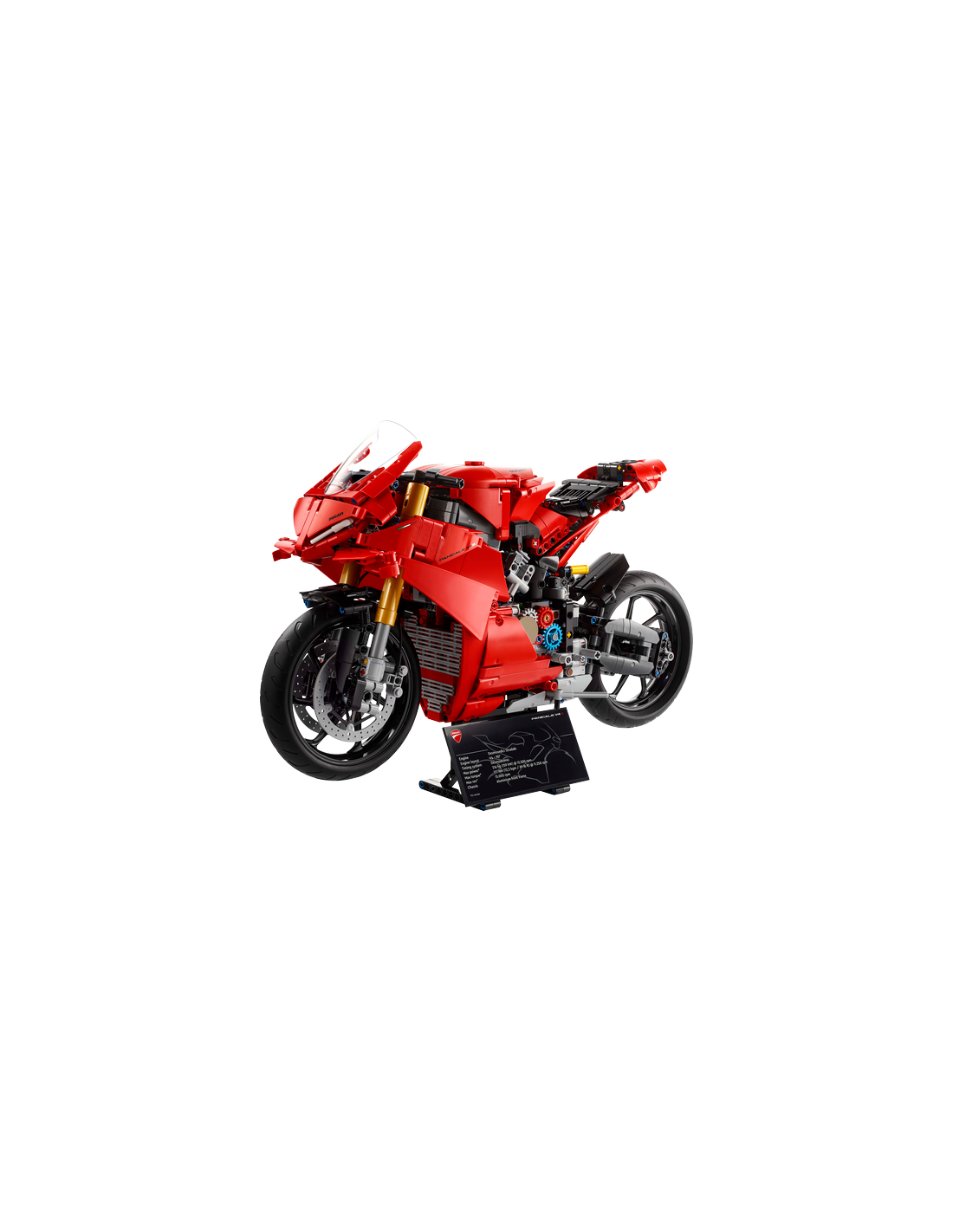Explora la suspensión delantera y trasera, y también la dirección. Echa un vistazo al pedal de cambio de marchas con caja de cambios de 3 velocidades (más punto muerto). Usa la rueda trasera para accionar la cadena, que se conecta a la caja de cambios y el motor V4. Con su icónico color rojo Ducati, esta maqueta es una idea de regalo sensacional para fans de las motos. Viene con una base para crear una llamativa pieza de exposición.