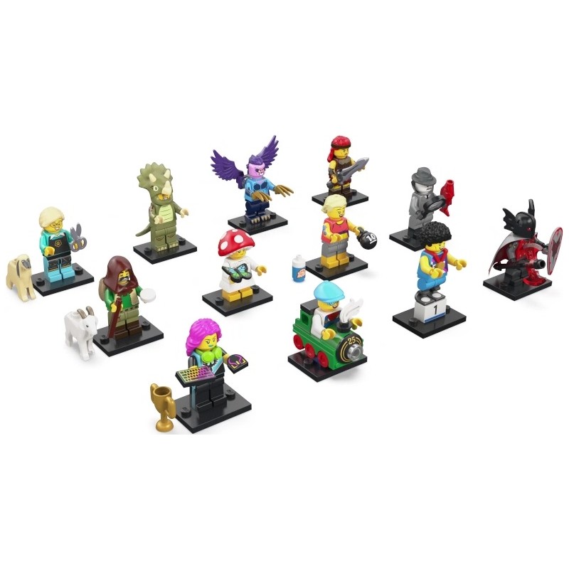 Colección completa de 12 minifiguras: el Fan con Disfraz de Triceratops, el Velocista, el Detective de Cine Negro, el Niño Tren, el Cabrero, el Caballero Vampiro, la Peluquera de Mascotas, la Monitora de Gimnasia, la Jugadora de E-Sports, la Seta Misteriosa, la Bárbara Feroz y la Arpía.