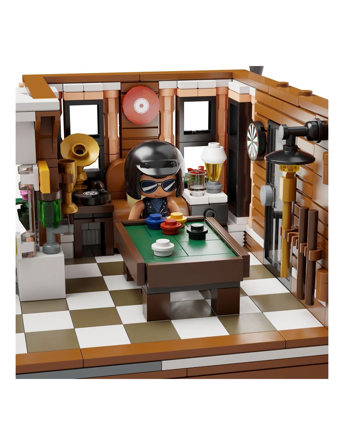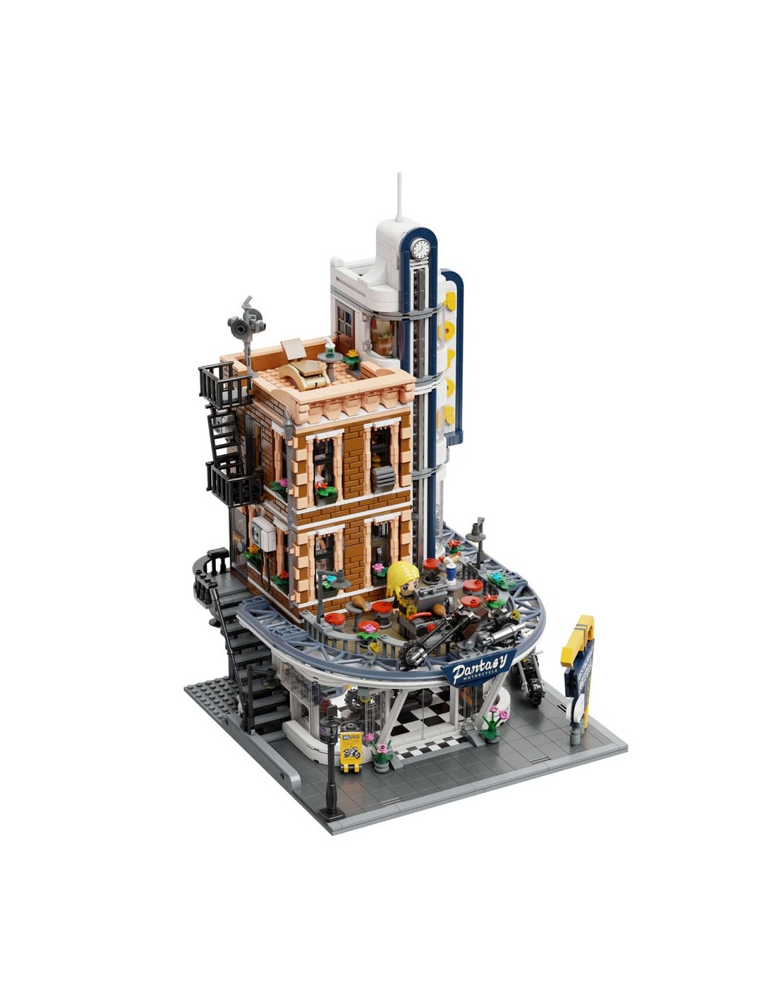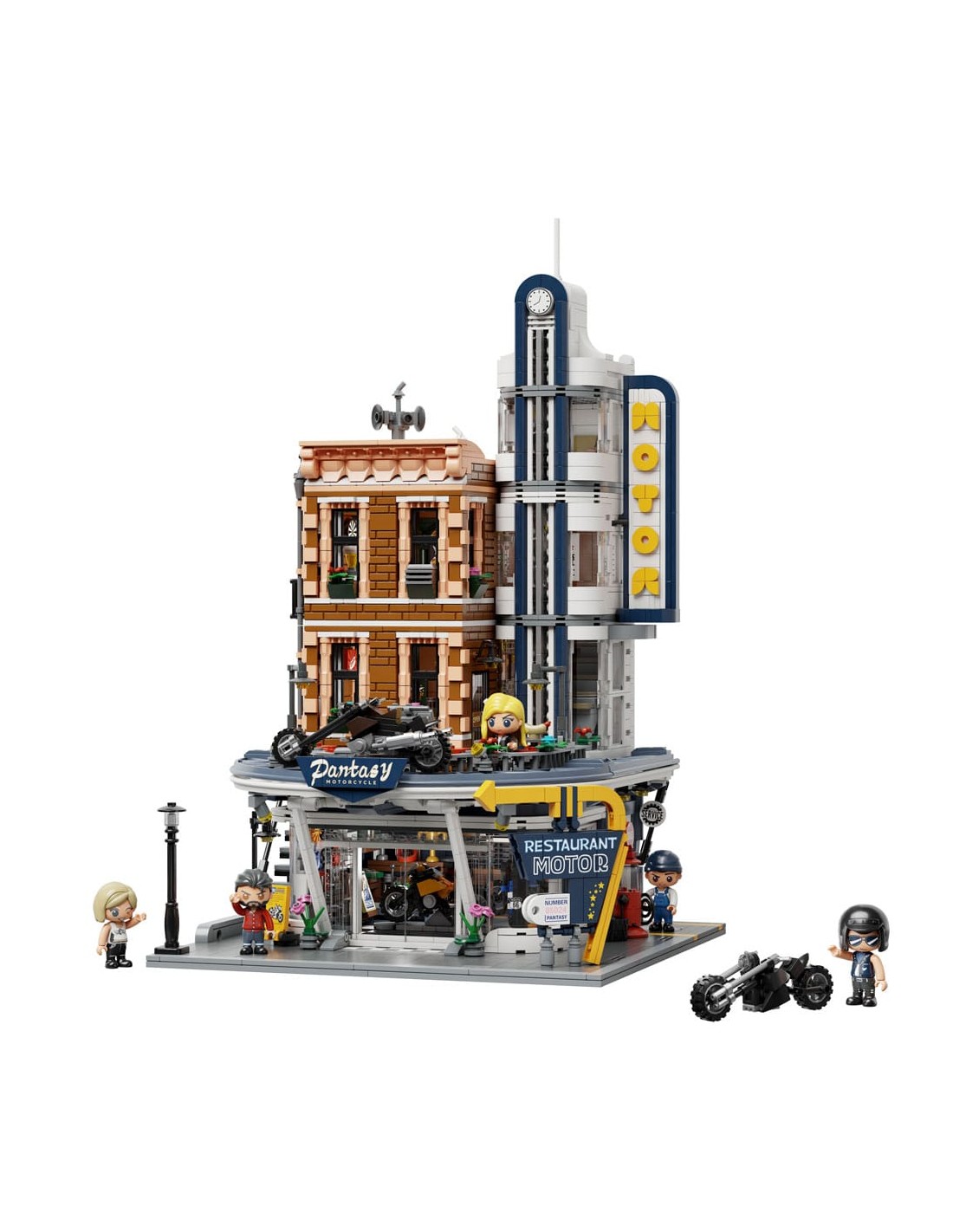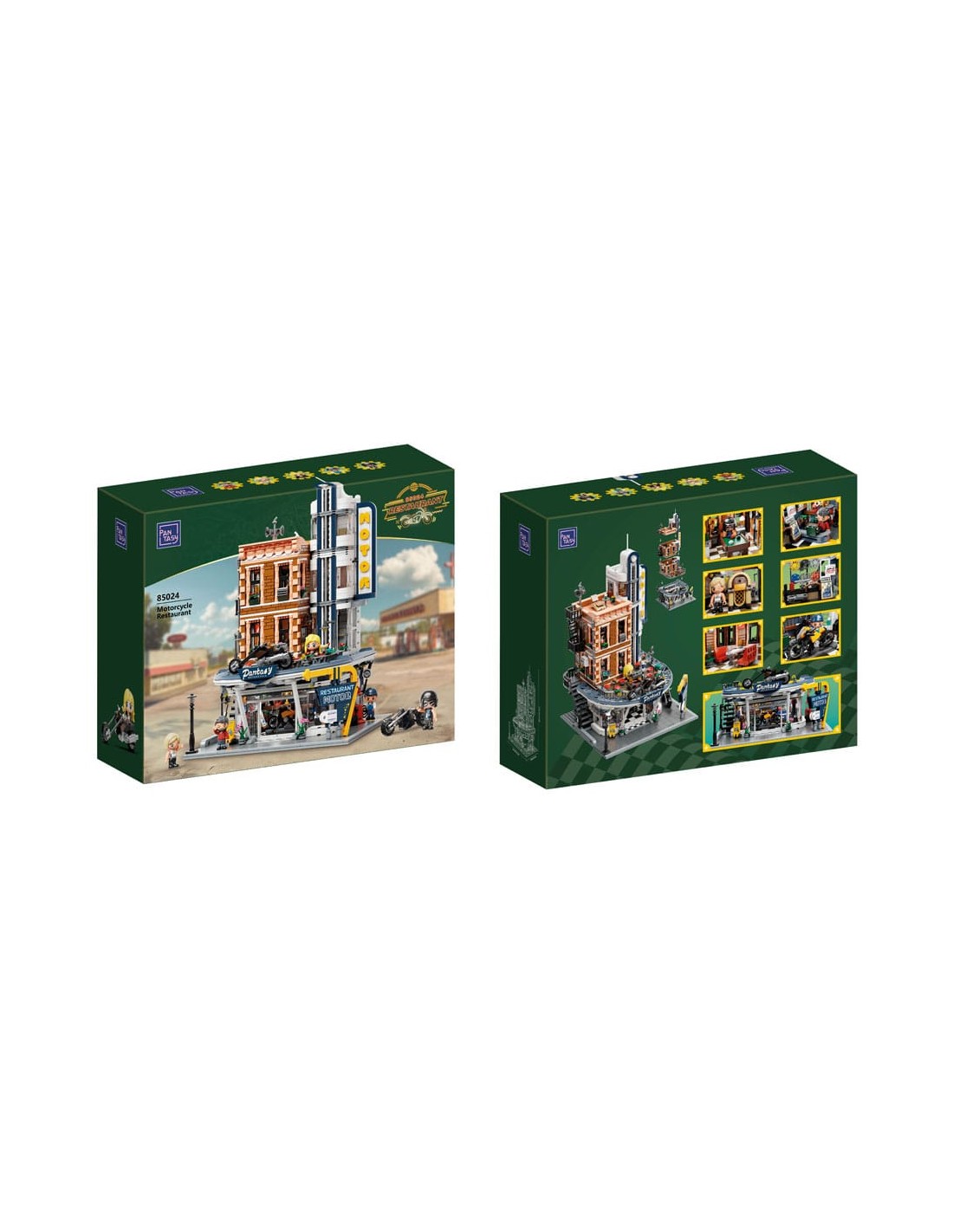 PANTASY 85024 Restaurante de Motocicletas, un edificio modular de estilo clásico compatible con otras marcas. Se caracteriza por sus detalles arquitectónicos, interiores completamente amueblados y la inclusión de cuatro modelos de motocicletas.