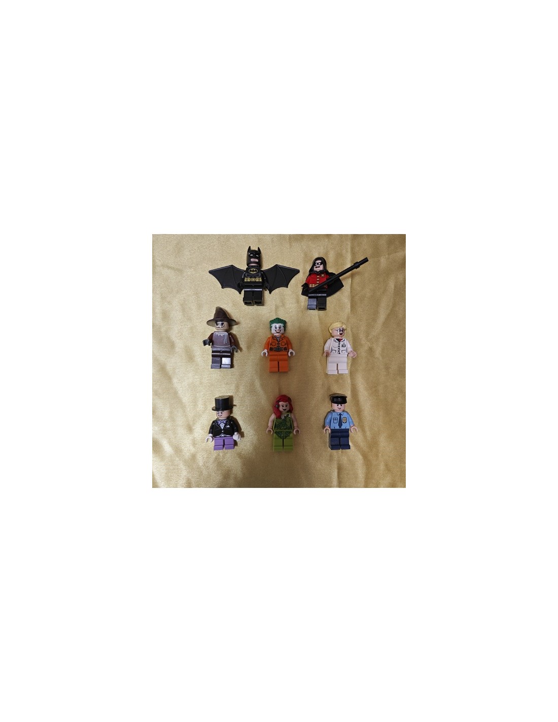 - Incluye 8 minifiguras: Batman, Robin, Joker, el Pingüino, Poison Ivy, Dra. Harleen Quinzel, Espantapájaros y un guardia, todos con una variedad de armas.